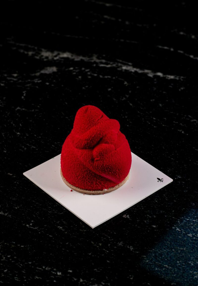 Mousse a base de pasta de pistacho, núcleo de mora y bizcocho de vainilla, cubierto de un crocante de frutos secos.